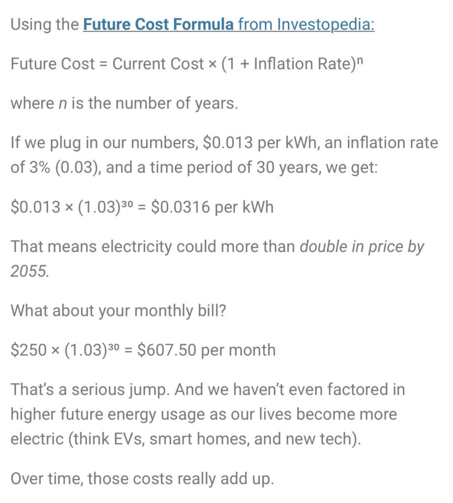 One of our favorite sections of MicroGrid Energy’s article is how they calculate the real cost of sticking with your utility company. Using average energy bills of $250 per month in San Antonio and factoring in a 3% annual rate of inflation, they project that bills could rise to over $600 per month by 2055.